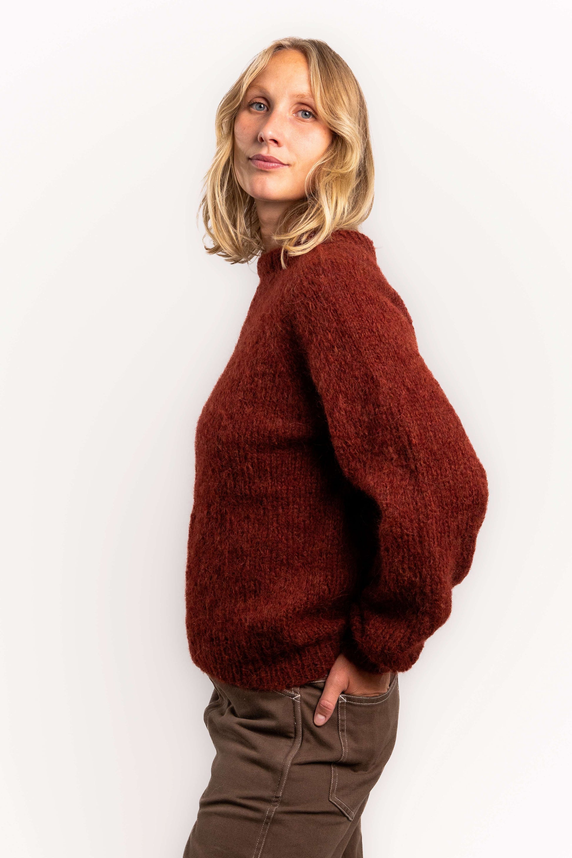 Ida alpaka sweater i farven Winered fra Coffee Beanies. Blusen er strikke af MERIDA.