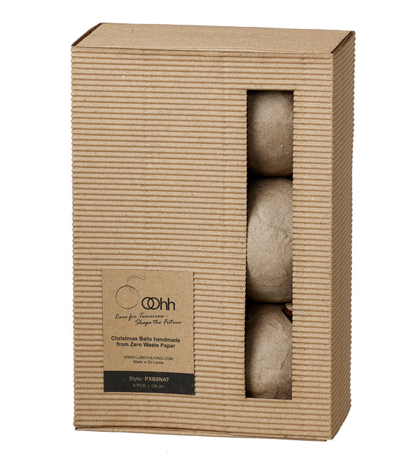 Disse smukke pulp julekugler fra OOhh er fremstillet af OOhh's eget zero waste papir. Hver julekugle er håndlavet med omhu og sans for detaljen, hvilket gør hver enkelt kugle helt unik. Det anvendte papir, som de bruger kommer fra datoudløbet aviser og andet affaldspapir, hvilket sikrer, at dette produkt har en minimal indvirkning på miljøet.
