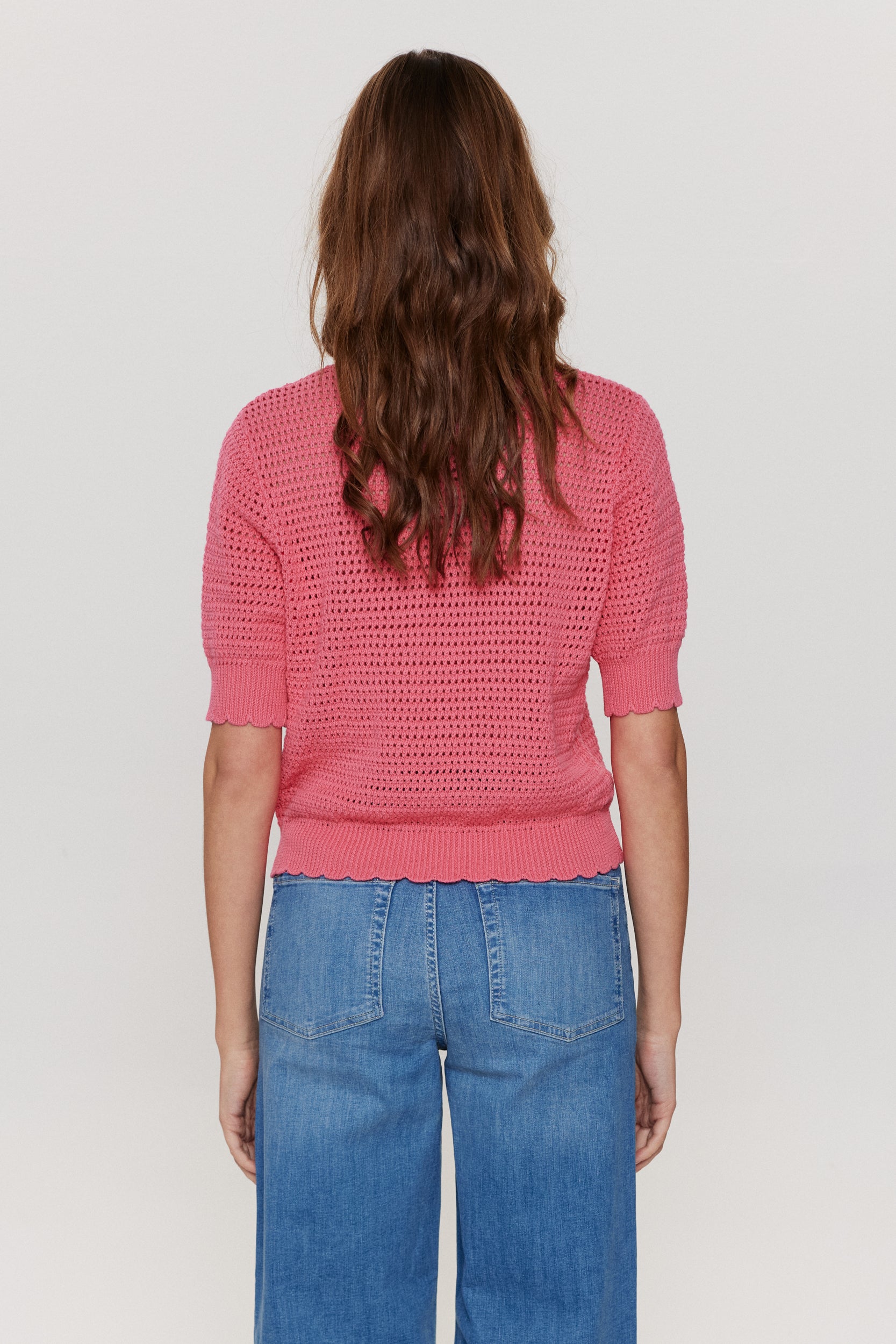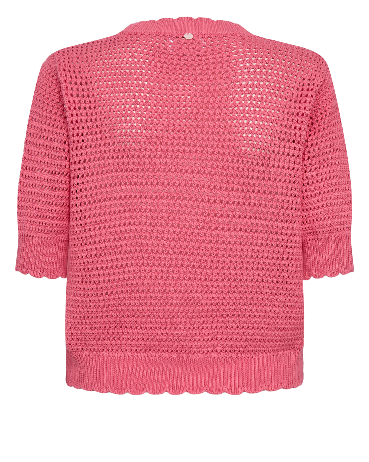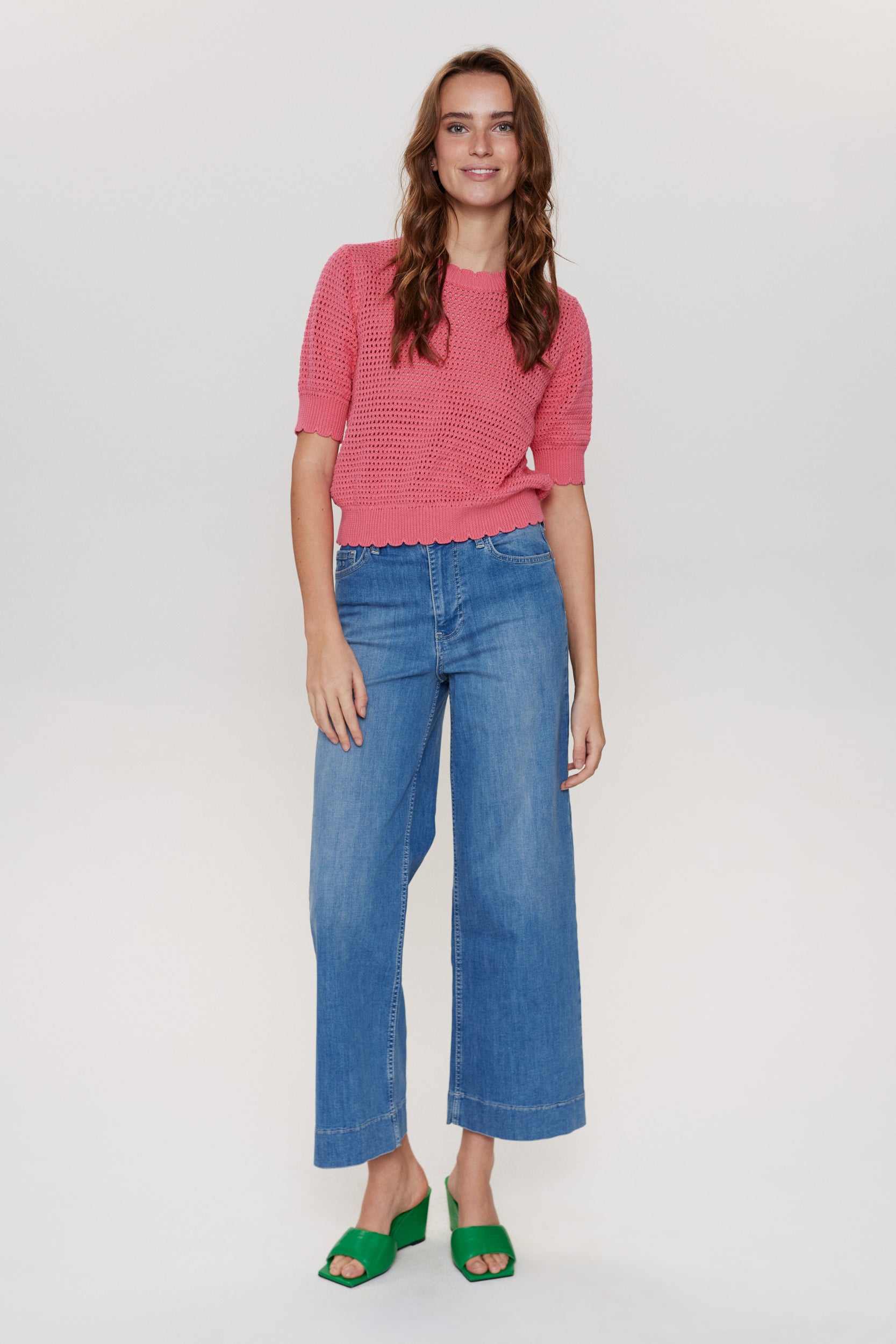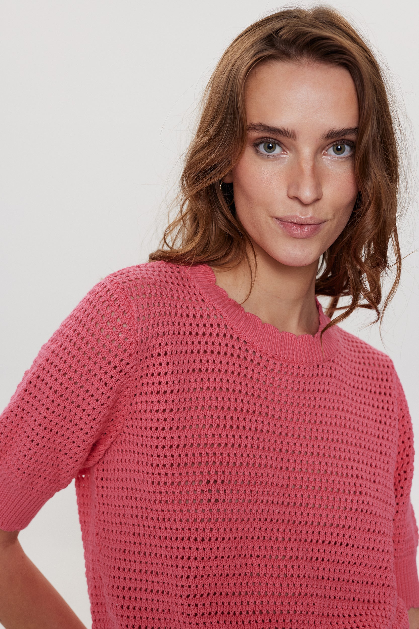 Nufanita strik Pullover i en flot Pink Lemonade fra Nümph. Blusen er med 2/4 ærmer og små lækre detaljer ved ærmegab og hals.